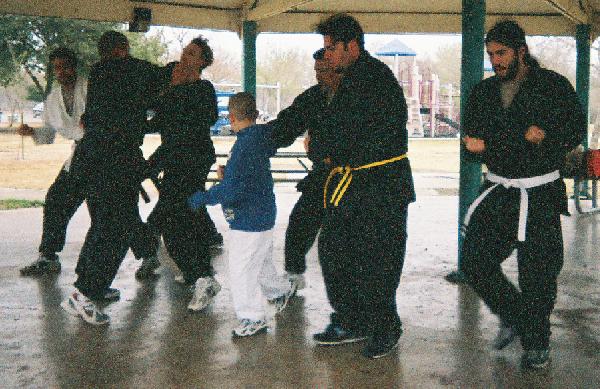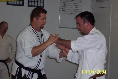 Attacking a student during kata practice.This type of training heightens the Awareness of the student. The "Attacks" are done at different levels depending on the students current level in training. Everything done in class is done to teach the student "How to Defend themselves!" Once the instructor starts one of these attacks the student must quickly gain "Control of the situation" by rapidly and effectively disabling the opponent and escape from the attacker by running away and Yelling "FIRE!". If the student has difficulty reacting to the attack the instructor works with the student to demonstrate how to escape from that type of attack. This type of repetitive practice gives the student the ability to become a "Reflexive Fighter".